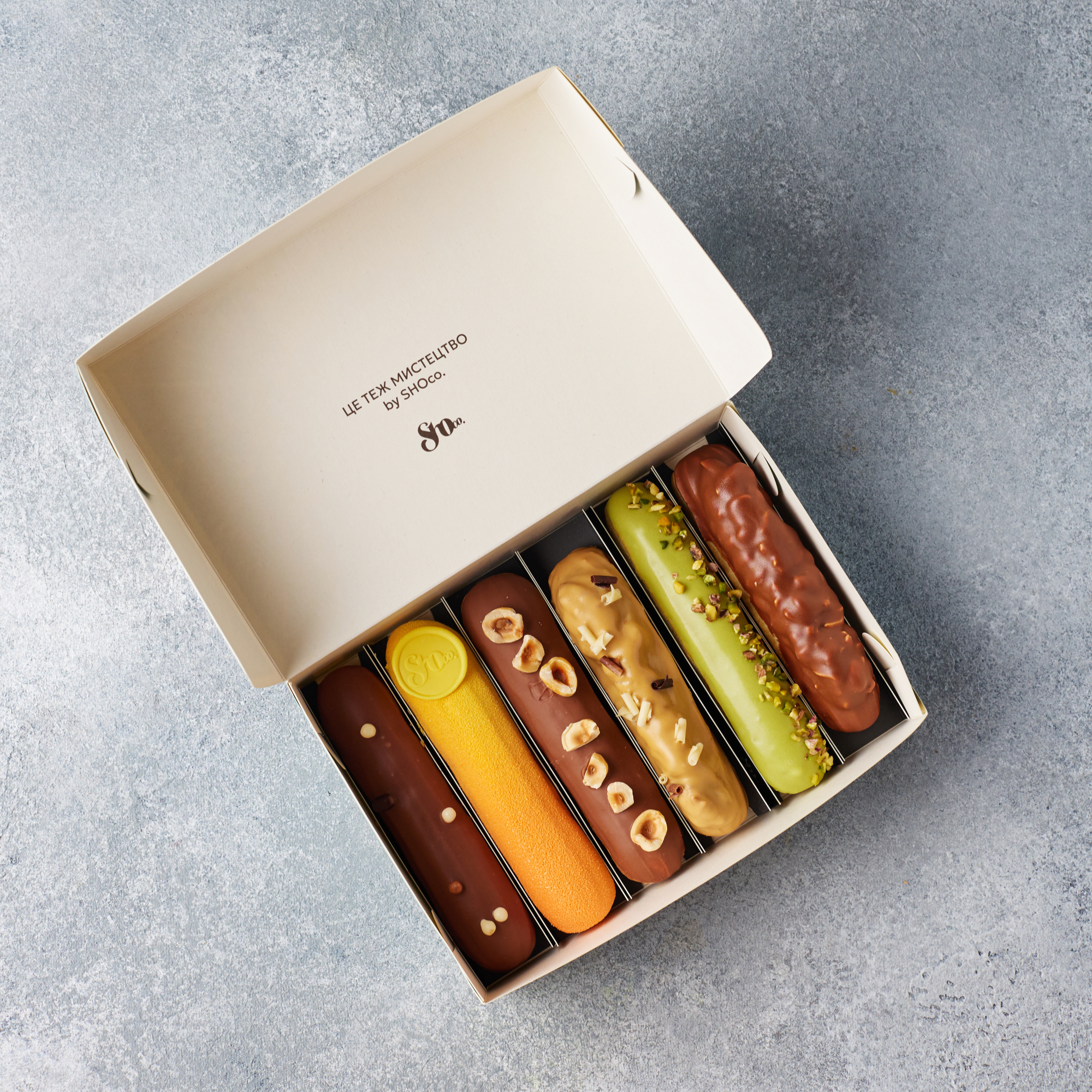 eclair flavors: Pear, Pistachio–Raspberry, Caramel, Mango, Baileys–Coffee, Vanilla