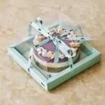 almond base with dates and cashews, mousse based on coconut milk and cashews, blueberry mousse