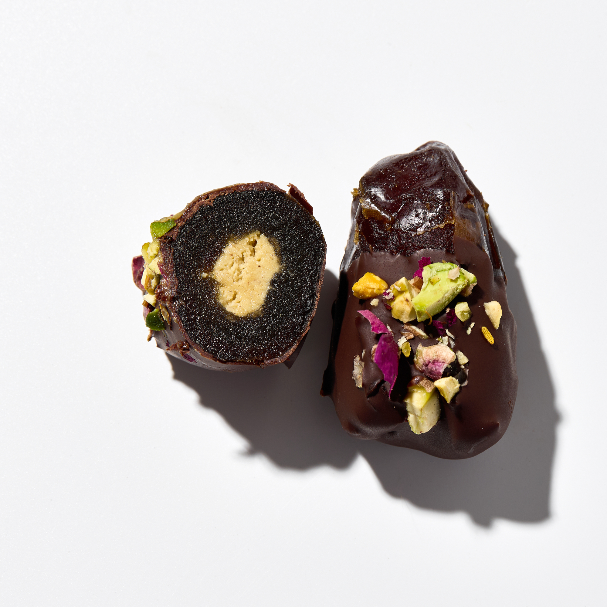 королівський фінік, масло, фісташкова паста покритий веганським шоколадом