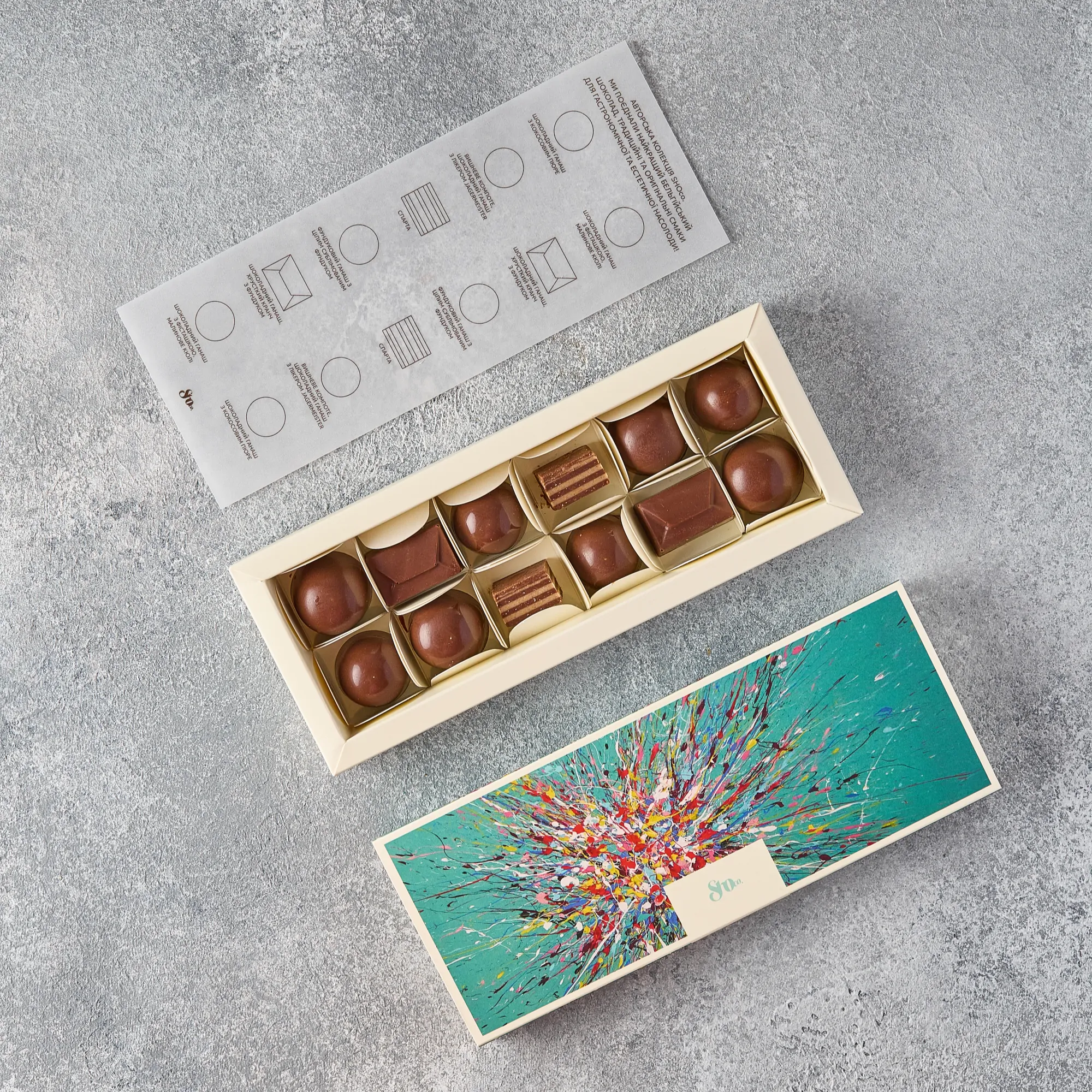 смаки цукерок: вишня-єгермейстер, фісташка-малина, фундуковий ганаш з сублімованм фундуком, шоколад-горіх-кранч,…