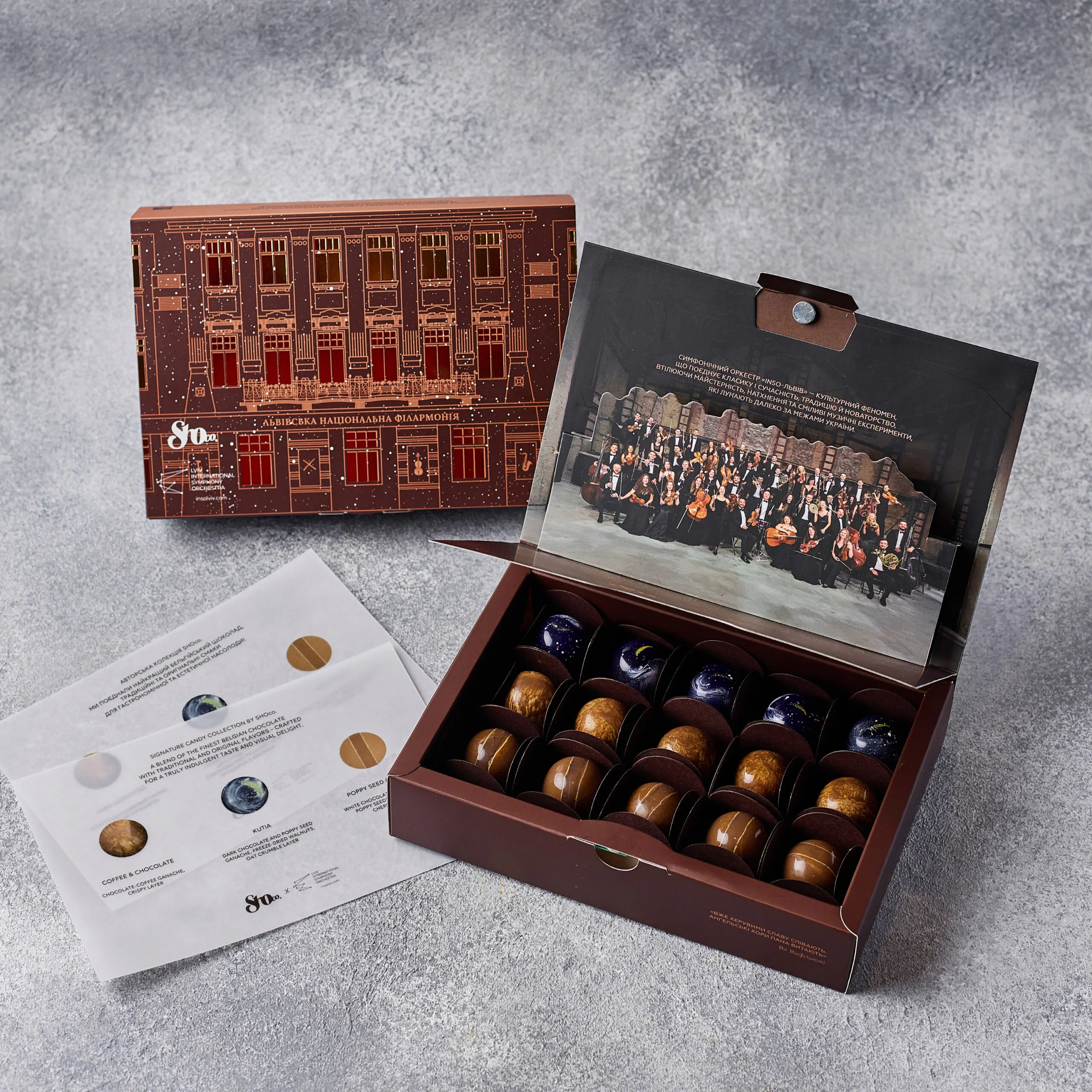смаки цукерок: вишня-єгермейстер, фісташка-малина, фундуковий ганаш з сублімованм фундуком, шоколад-горіх-кранч,…
