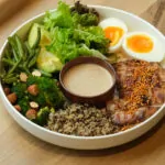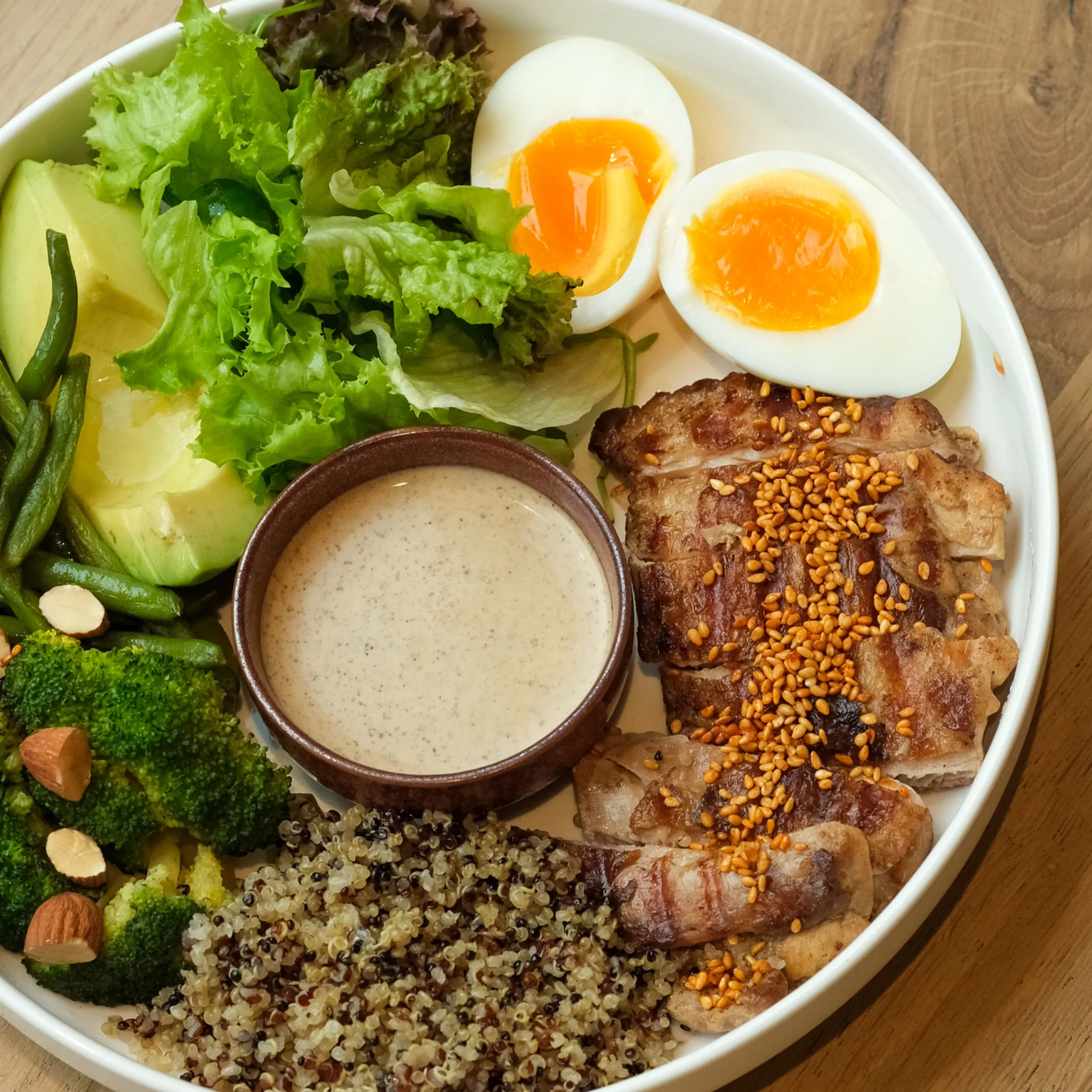 курка грильована, яйце, мікс салату, кіноа, авокадо, броколі, стручкова квасоля, мигдаль, кунжут кімчі, кунжутний соус