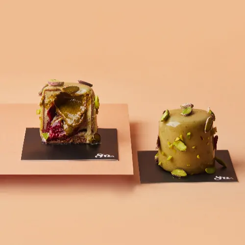 фісташкова паста, вишневе компоте , фісташковий мус на основі фісташкової пасти та білого шоколаду, хрусткий прошарок на основі роялтину, молочного шоколаду і фісташкової пасти, глазур на основі фісташкової пасти