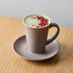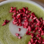 поєднання класичної матчі з рослинним молоком та фісташковою пастою, доповнене сублімованою малиною у декорі