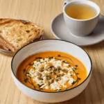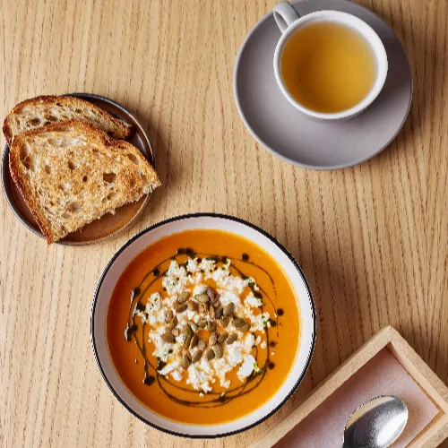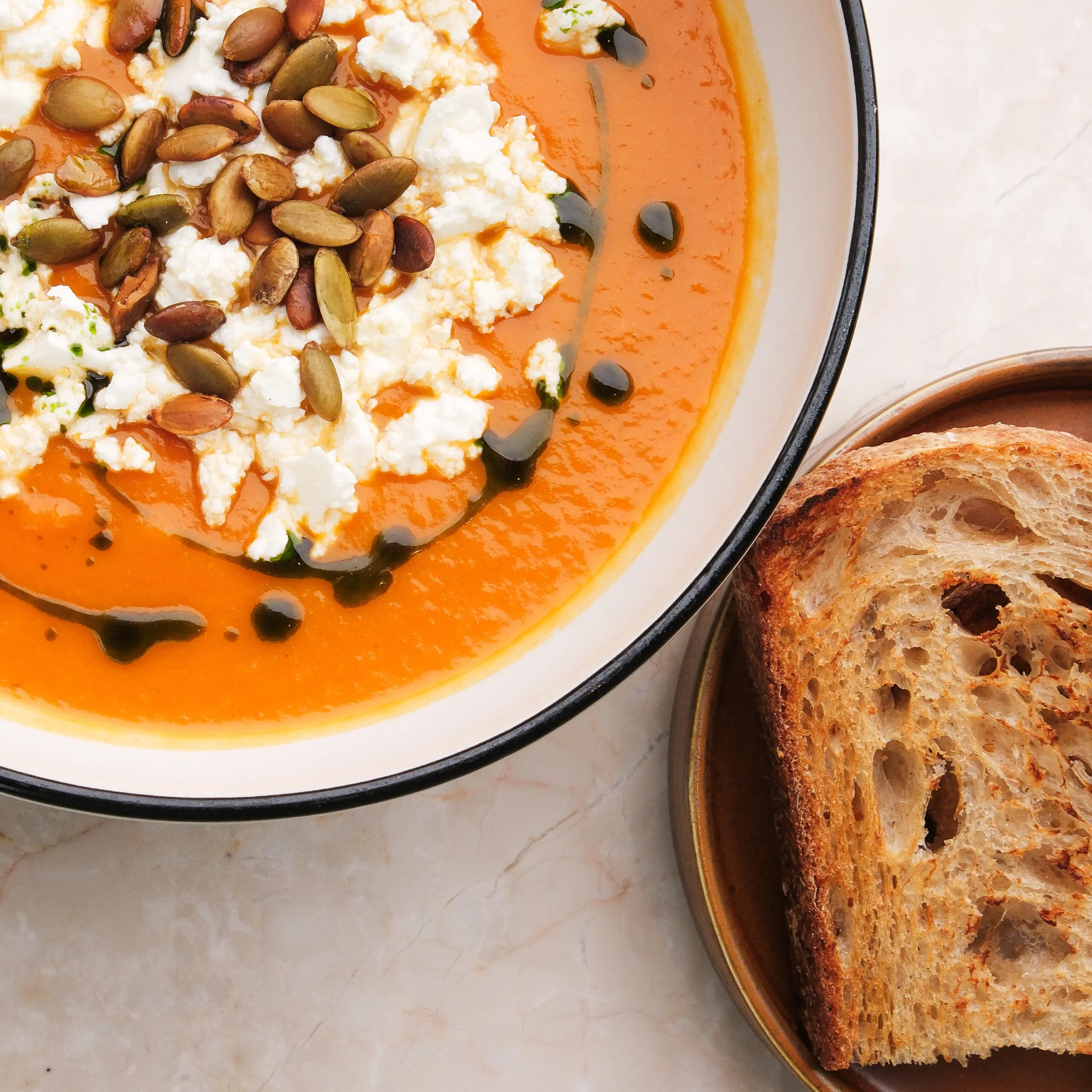 гарбуз, селера, цибуля, часник, перець чилі, томати, молоко кокосове, сир Фета, зелена олія, гарбузове насіння, солодовий хліб з насінням гарбуза хліб