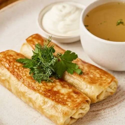 млинці з мʼясною начинкою, сметана, курячий бульйон