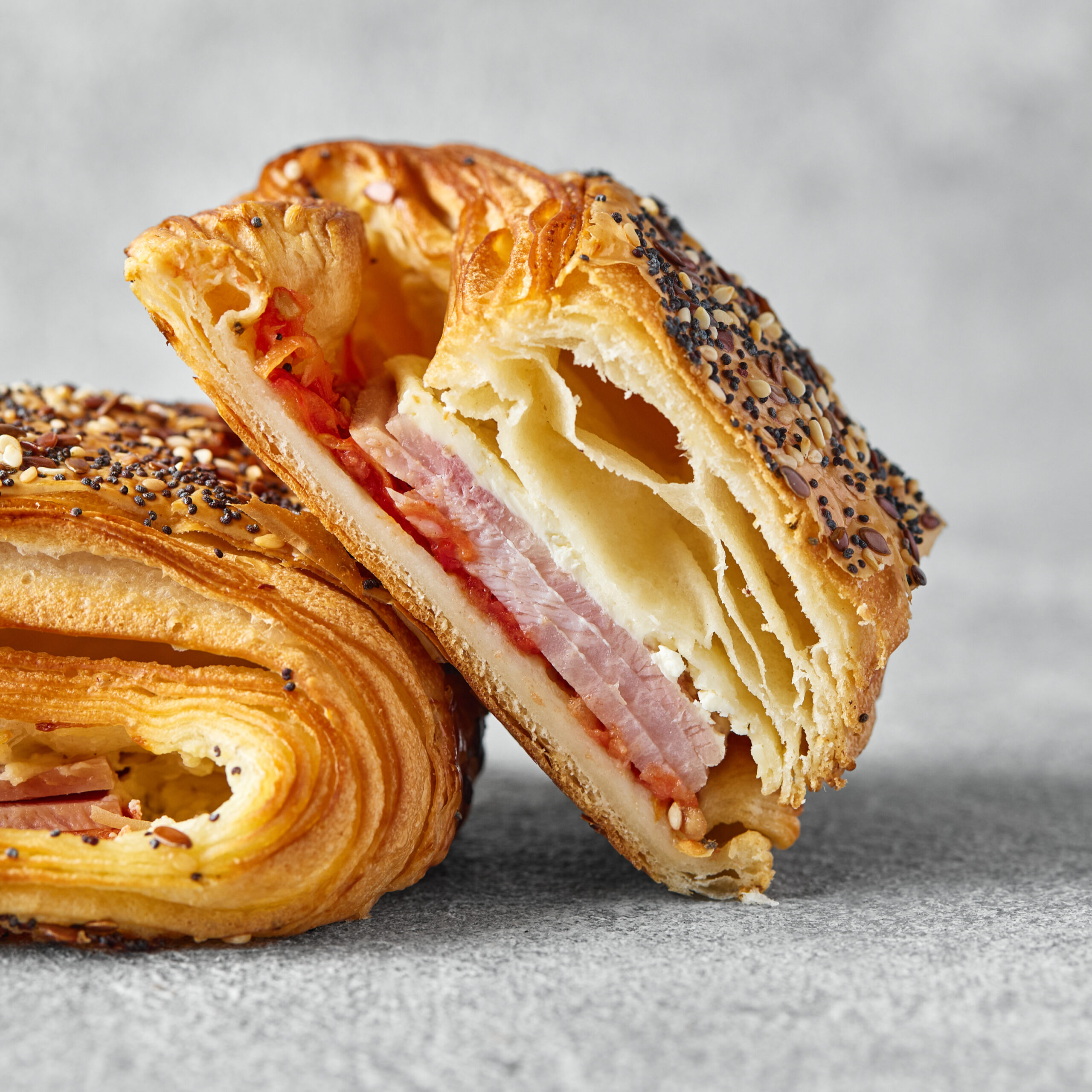 листкове тісто, крем-сир Філадельфія, прошутто котто, рожеві томати