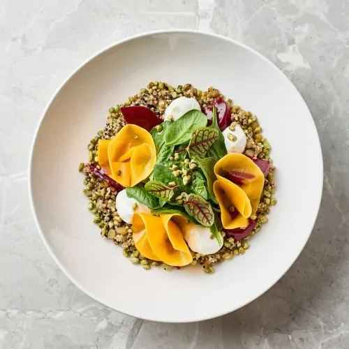 кіноа, сочевиця, буряк у су-віді, гарбуз маринований, мус з пармезану та крем-сиру, карамелізована фісташка, свіжий шпинат, мигдалево-м'ятний соус