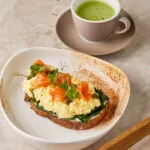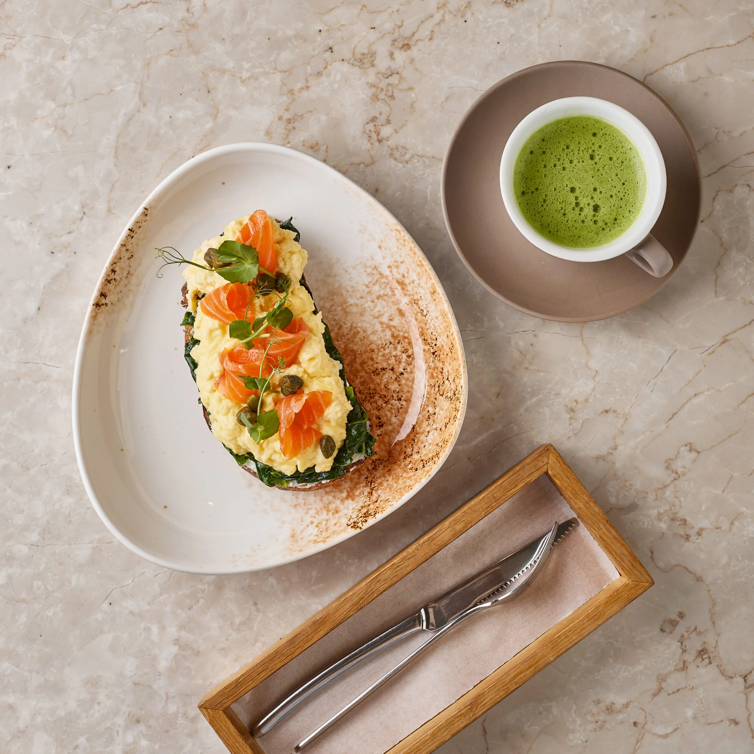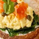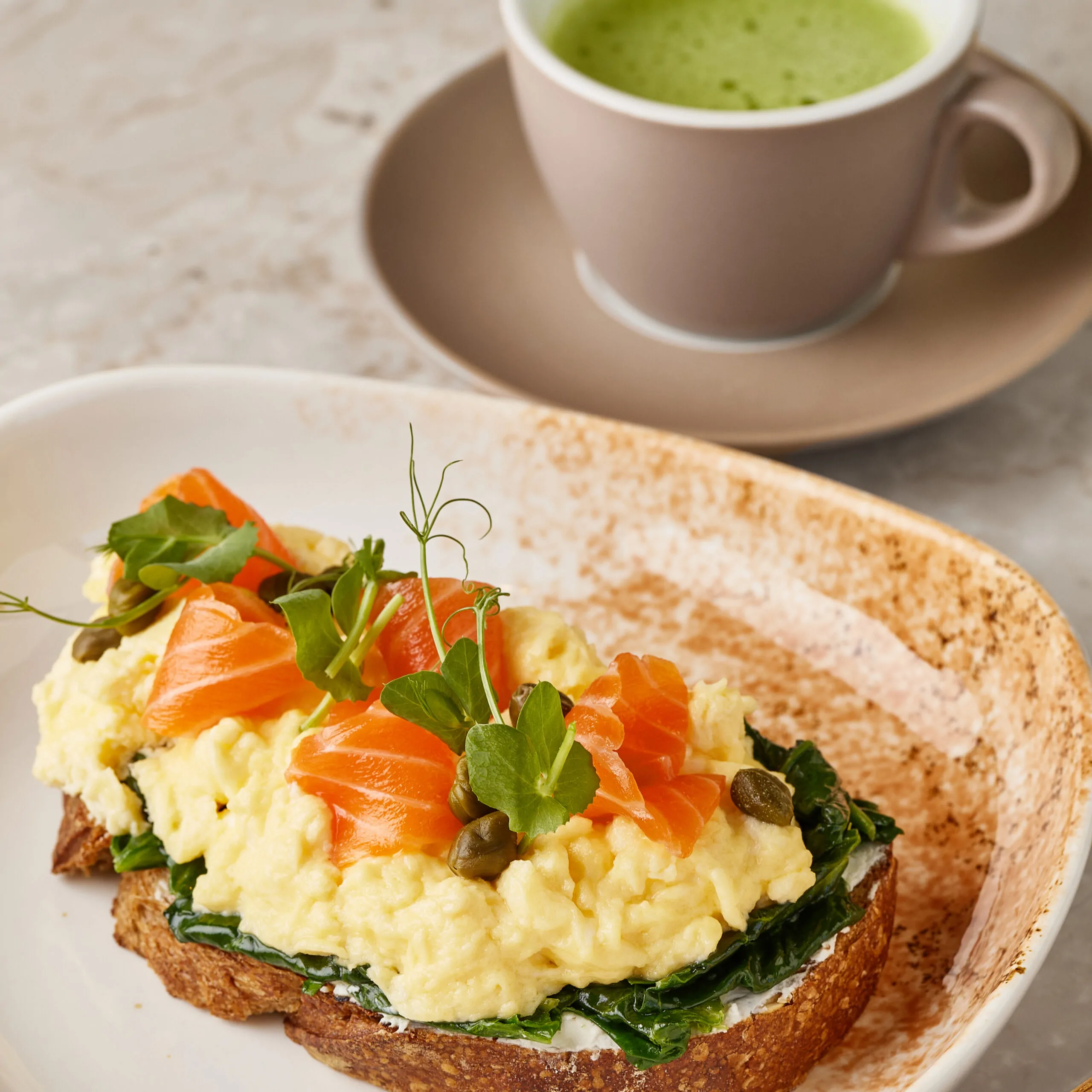 солодовий хліб, крем-сир, шпинат, скрамбл, лосось слабосолений, каперси мариновані, зелень мікрогріну