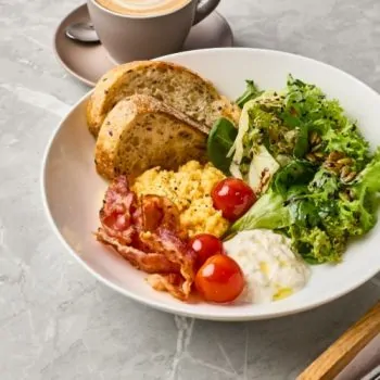 томати Черрі гриль, грінка пшеничного хліба з льоном та маком, мікс салату, бальзамічний соус