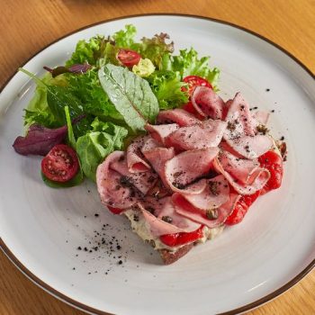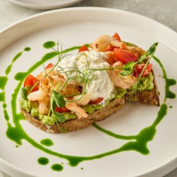 цільнозернова грінка, пюре авокадо, яйце пашот, в’ялені томати, страчателла, мікс салату, томати Черрі