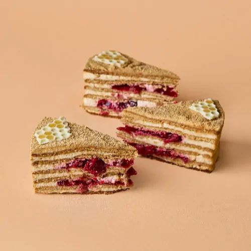 сметанковий крем, вишневе компоте зі шматочками вишні, медові коржі